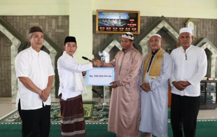 Mendo Barat - Bupati Bangka, Mulkan SH MH menyerahkan bantuan pembangunan Masjid Nurul Iman desa Paya Benua Kecamatan Mendo Barat, Jum'at (14/2/2020). Bantuan tersebut diberikan dalam bentuk uang sebesar 500 juta rupiah dan langsung dikelola oleh pengurus Masjid Nurul Iman.